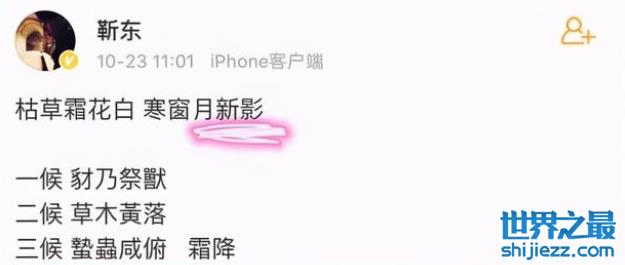 靳东还不止一次翻车,还是连续翻车。之前霜降时节,他在社交媒体上发文,其中一段文字是“枯草霜花白,寒窗月新影”。网友发现不对劲,此诗的出处是陆游《霜月》,原文应该是“寒窗月影新”靳东把最后俩字位置颠倒了,也是很尴尬。