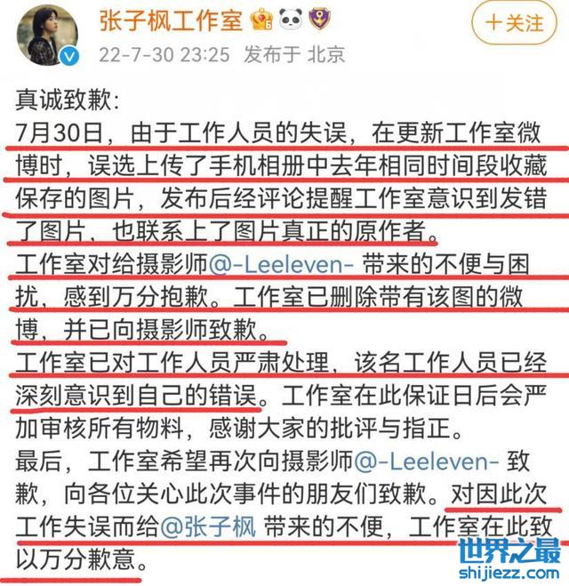 近日,张子枫工作室道歉登上热搜,原因是张子枫工作室发图时,其中第五张图是某摄影博主拍的,并非文中工作室拍摄。工作室把水印截掉换上滤镜,重新发出来。