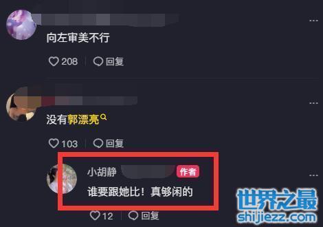 有不少人都拿“小胡静”和郭碧婷相比,都认为她没有郭碧婷漂亮,对此,“小胡静”也给出回应:“谁要跟她比,真够闲的”,看来这个“小胡静”根本没把郭碧婷放在眼里,懒得跟郭碧婷比美。