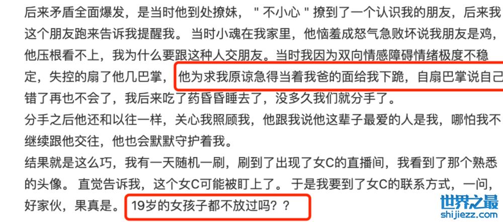 后来两人见面,senko酱因为朋友被诋毁当场扇了男方几巴掌,小魂当着senko酱爸爸的面下跪道歉,senko酱狠下心分手,但分手后小魂依旧缠着她、哄着她,说这辈子最爱的是她。但话虽然说得漂亮,心还是不专一,senko酱某天发现小魂头像出现在19岁C女直播间,才彻底对其死心,决心曝光。
