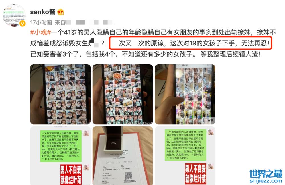据senko酱爆料,小魂在三年前,隐瞒真实年龄和有女朋友的情况下追求自己,期间一直对女朋友A冷暴力并分手。半年多后两人确定恋爱关系,还一起出去旅游。后来senko酱看到他的身份证才知道被骗。