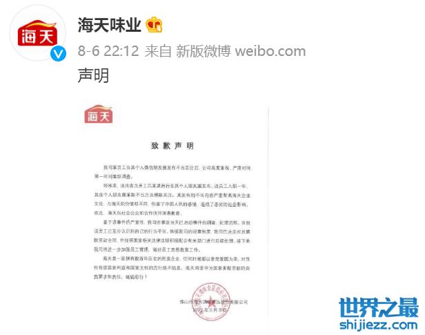 目前,海天酱油的员工朋朋已正式道歉,也删除了相关朋友圈,并且海天味业官方在8月6日也发表了致歉声明。表示该员工在其个人朋友圈发布不当言论后,公司高度重视,并且第一时间组织调查,目前已经根据规章制度,决定与该员工解除劳动合同,并积极配合相关部门进行后续处理,做好员工思想教育工作。