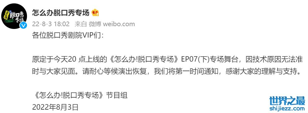 在品牌道歉后,8月8日,《怎么办脱口秀专场》也对外宣布本周恢复正常播出,而且一周连播三天,将之前没有播出的以及下周要播的都放到这周一起播放,对不少网友来说,这绝对是一个好消息。
