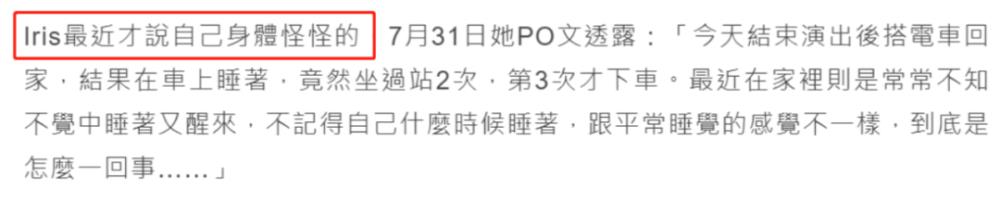 粉丝开始回忆,从7月份开始,爱丽丝就断断续续在社交平台表示,自己近来很容易昏睡,时常觉得困倦、很累。