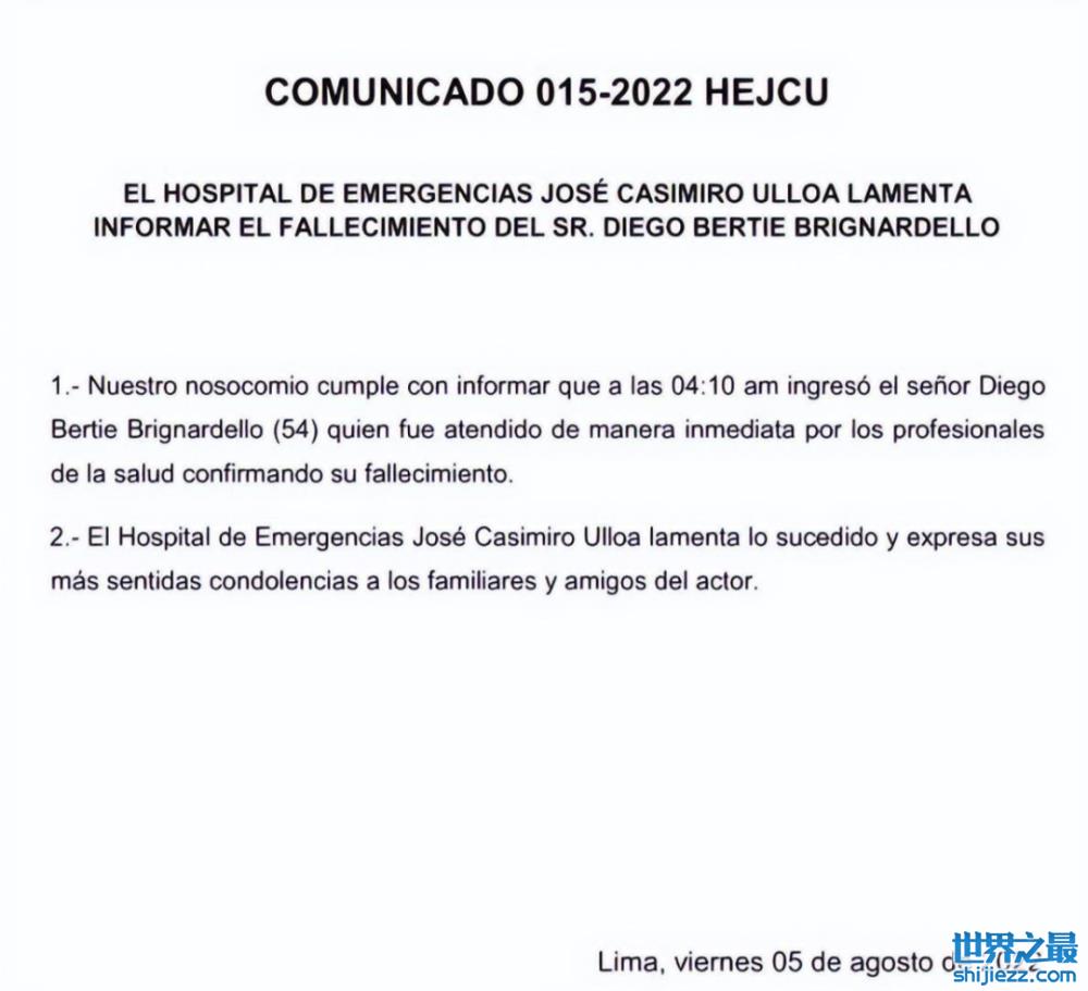 曾出演电影《娜塔莎》《没有同情》的秘鲁男演员伯蒂,于8月5日晚会被发现夹在一辆汽车与墙壁之间。