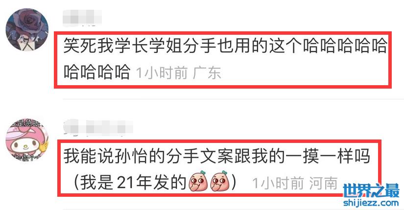 但令人没想到的是,在两人官宣离婚后,有不少网友表示两人的分手文案和自己分手时的文案相同,被质疑是不是从网上搜的。