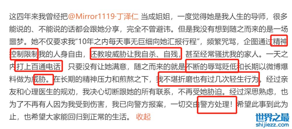 在丁泽仁的自曝长文中得知,1、站姐疑似通过精神控制的方式,限制了他的人身自由;2、站姐曾教唆他自残轻生;3、每天要打上百通电话;4、长期遭站姐辱骂贬低等。爆料文章信息量极大,引起了不少网友们的关注。