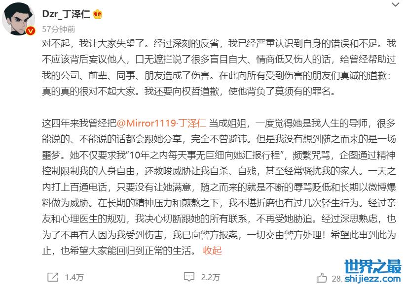 近日,丁泽仁在社交平台上发文针对引起大家热议的“唯一的姐姐”语音进行道歉,但在长文的第二段,丁泽仁却开始谴责起了自己的站姐,并疑似曝光了很多站姐的“恶行”。