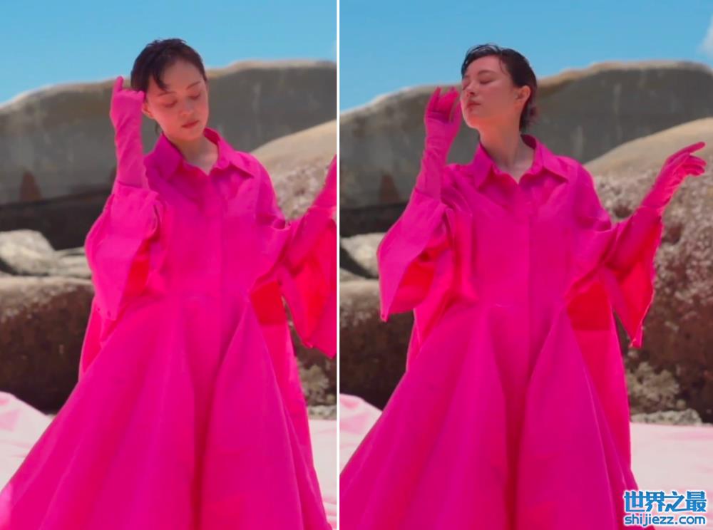 孙俪海边大片造型奇葩!全身粉色满脸通红,躺礁石拍照吓出表情包 ...