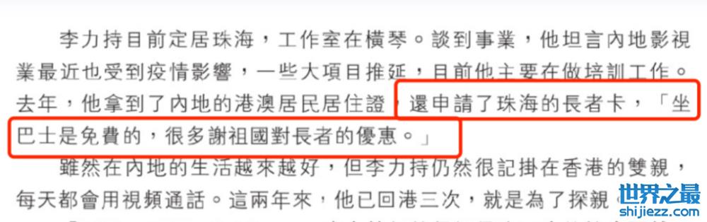 据悉,61岁的李力持早就拿到了内地居住证,还在珠海拿到了长者卡,坐公交车都是免费的,他也表示很感谢祖国对长者的优惠政策。