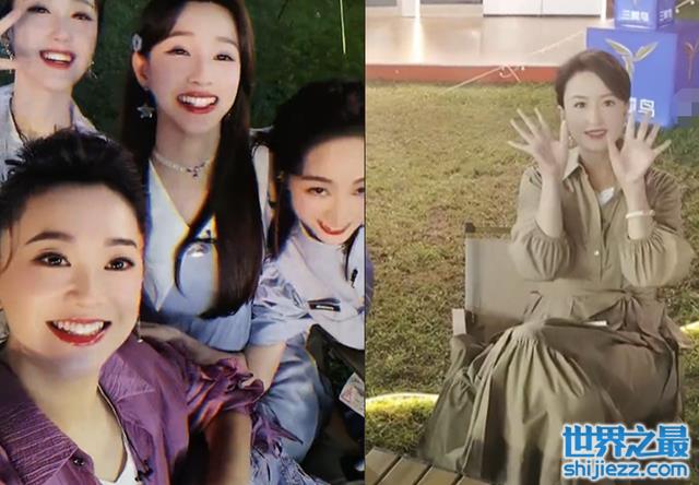 众主持围坐在一张小桌子旁,随着镜头的移动他们纷纷挥舞双手打招呼。其中张蕾一袭长裙,坐姿淑女娴静,自带“岁月静好”气场,就像一位优雅女神,在一群气质出众的主持里也十分亮眼。