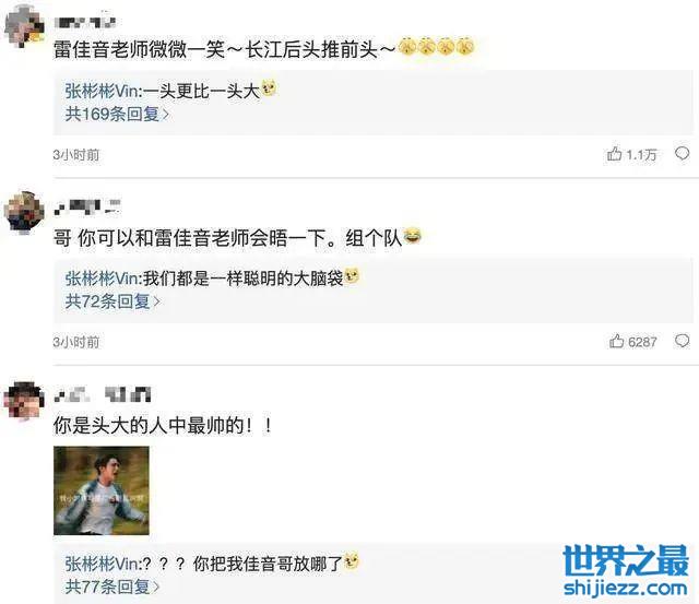 张彬彬心态也是挺好的,称自己的大头是聪明的大脑袋。网友调侃张彬彬的大头可以和雷佳音一较高下(这个话题真是绕不开雷佳音了)