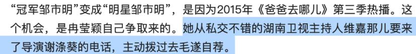 《爸爸去哪儿》就是冉莹颖要了导演电话,主动毛遂自荐为邹市明争取来的,让他迎来了事业第二春。