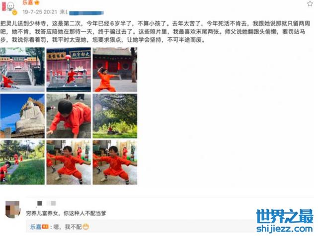 乐嘉对女儿灵儿的教育一直都非常严格,在灵儿很小的时候就送去少林寺学习,并将灵儿两次送过去。只见灵儿穿着红色的练功服,又是蹲马步,又是打拳。不过这样的教育方式并不被网友认同,甚至评价乐嘉“不配当爹”。