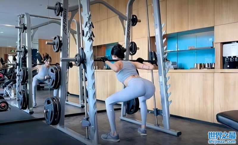 开始正式运动时,王紫璇先是做了几组哑铃深蹲。深蹲的动作将她的臀部线条展现得淋漓尽致,蜜桃臀、大长腿,看得出身材比例十分优越。