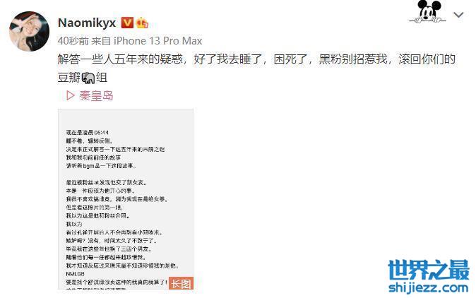 8月14日一大早,女模Naomi称自己写了3000多字的长文,回应这些年来关于他的恋情情况。