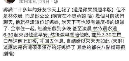 林依晨在2014年与圈外男友林于超完婚后,就曾经被友人爆料:她公公的描述,林依晨哪怕是拍戏到凌晨才回家,也会在第二天凌晨6点早起伺候公婆,恭送公公出门后才继续休息。