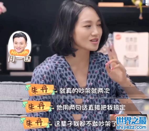 朱丹在节目里分享周一围吵架的段位,用炫耀的语气说出:“自己跟他就吵过两次架,周一围只用了两句话,让我这辈子都不敢吵架了。”
