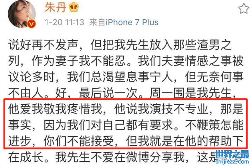 朱丹不仅包容,还经常在为自己老公冲在舆论前线,而周一围从不发声。比如周一围从来不在动态里发朱丹、秀恩爱,朱丹在镜头表示体谅他:他只是想做一个纯粹的演员。