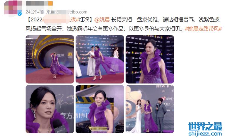 在盛典之上,姚晨身着一袭紫色华服登上红毯,分外隆重。从姚晨的打扮可以看出,自己也是花了很大的心思,为了此次红毯选择了某品牌定制款长裙,上身纱裙胸前开叉明显,而下半身是一条紧身包臀裙,配上紫色薄纱披风,整个人气场全开。