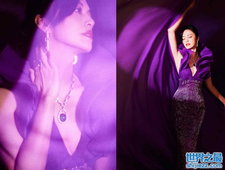 不仅如此,姚晨也用了不少珠宝对自己的华服进行点缀,脖子上带了一块超大的宝石项链,格外引人注目,一对超级亮眼的大耳环也吸睛不少,配上紫色系的妆容和挽起的头发,整个人女王霸气十足,精致又干练。