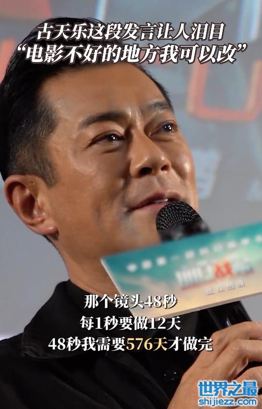 同时,古天乐还提到新片里有一个48秒的特效镜头,团队为了呈现最好的效果,用了近576天才做好。谈到这里时,古天乐眼眶含泪,说话有些哽咽,身影看起来格外落寞。