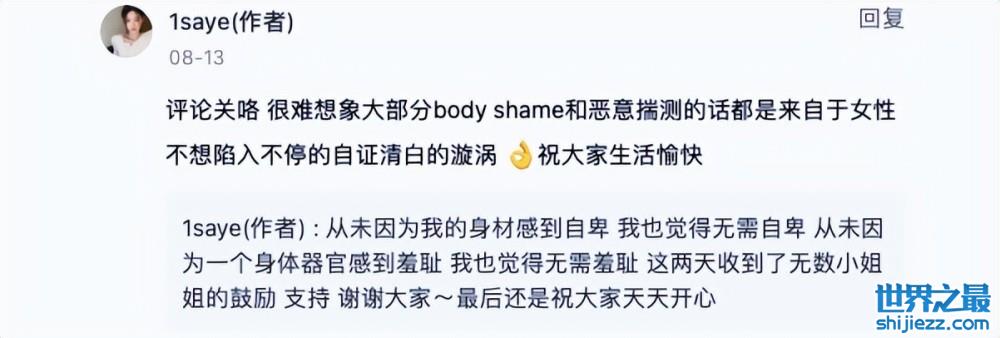 随着争议声越来越多,1saye亲自回应了那些不友好的声音,他表示从未因自己的身材感到自卑,也没有因为一个身体器官感到羞耻,有很多小姐姐给予她鼓励,非常感激。