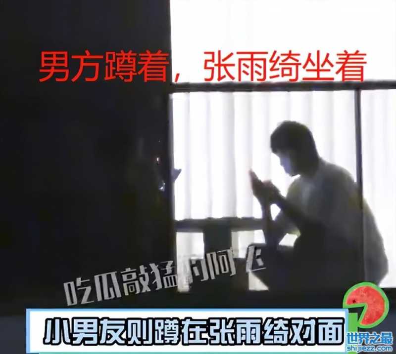 有意思是,张雨绮全程坐在角落里,男方则是蹲在小茶几的边上,两人的相处状态看起来颇为真实,私下生活中的张雨绮和似乎和镜头前的霸气女王没啥区别。