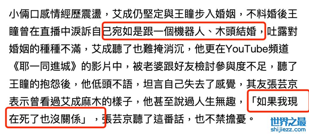同时,也有网友扒出艾成老婆王瞳曾在直播间抱怨,称艾成不懂风情,生活中像个木头,没什么情绪起伏。曾和艾成一起连麦唱歌的歌手张芸京也透露,曾经听过艾成觉得人生无趣,说过“如果我现在死了也没关系”的话。艾成消极厌世的情绪,也一度让亲友倍感担忧,多次劝解效果不大。