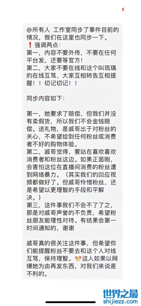 这位网友还遭到了戚薇粉丝的围攻,晒出戚薇粉丝群的聊天记录,给出统一的控评文案,内容是不承认戚薇卖了假货,送礼物是戚薇对于粉丝的关心,不希望给任何粉丝或消费者不好的购物体验,还说这件事最好不了了之,如果后续再爆出什么是对戚薇不利的,也提醒粉丝不要和这位爆料者互骂,保持理性。