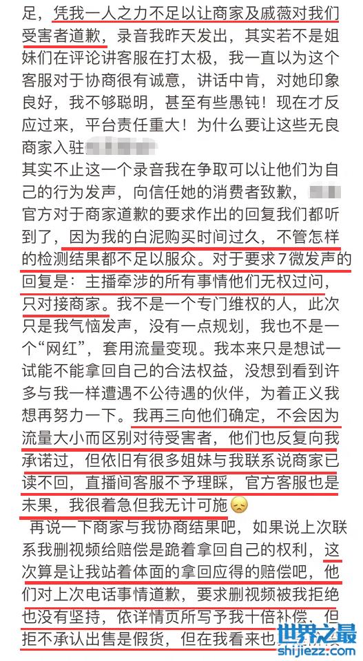 后续这位买家又将整件事做了详细说明,告知凭借她一人之力不足以让商家及戚薇对我们受害者道歉,客服在给她打太极,被要求道歉商家给的回复是:因为购买白泥的时间过久,加上检测结果不足以服众,所以不会道歉,该网友让戚薇发声,客服给出的回复是:主播牵涉的所有事情他们无权过问,只对接商家。