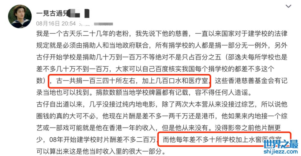 更有声音说,古天乐只是捐了几栋教学楼,而且只是一部分,压根没多少钱。逼得粉丝没有办法,只能出来做澄清说明,因为按照古天乐本人的性格,他是不会解释这些的。