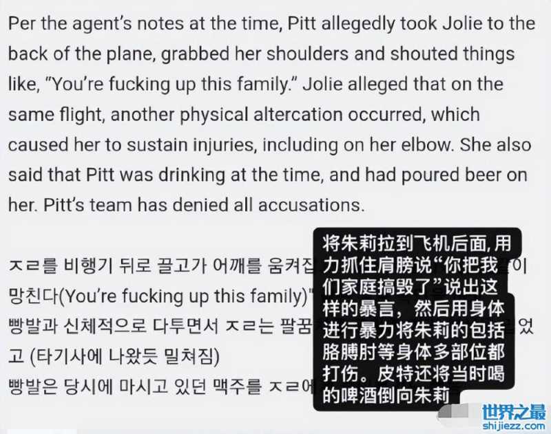 15岁的继子试图维护自己的母亲,但也遭到了布拉德皮特的殴打,据报导得知布拉德皮特抓住了安吉丽娜的肩膀并且说出“你把我们的家庭搞毁”了的惊人言论,之后就开始对妻子进行暴力攻击,以至于安吉丽娜朱莉身体多个部位都受到了创伤。