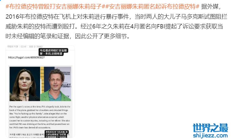 近日,有媒体爆料安吉丽娜朱莉匿名起诉前夫布拉德皮特,罪名为2016年时他曾在飞机上对妻儿两人进行家暴。