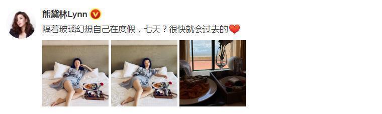 8月19日,熊黛林分享自己在某豪华酒店内隔离的照片。熊黛林:隔着玻璃幻想自己在度假,7天?很快就会过去的!