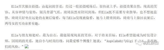 她3岁就开始学走猫步,时尚基因是刻在骨子里的,琦琦又跟Angelababy 所属的模特儿公司关系不错,摄影师就请任晴佳拍了一组照片。