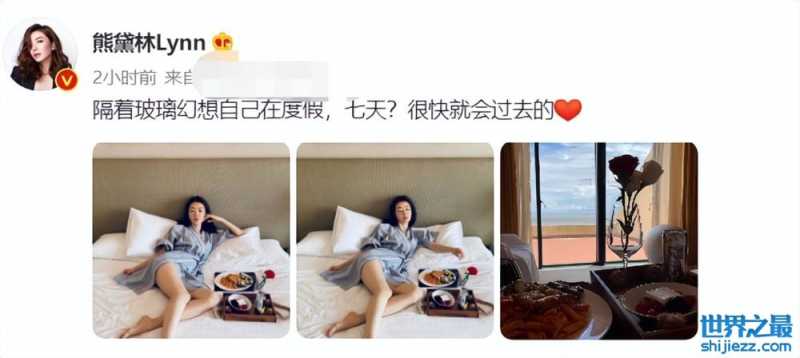 躺在床上的熊黛林也是姿势撩人,性感妩媚,画着淡妆的她状态在线,分外享受这样的休闲时光。而床上还摆着餐盘和食物,让她能够不费力就拿得到,配上窗外好风景,着实令人心情愉悦。