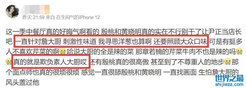 更令人无语的是,最后大家定的菜,有4个都是辣菜,不免让人觉得当时就是有点挑刺詹大厨,导致网友们十分不满,认为有点欺负厨师的意思。