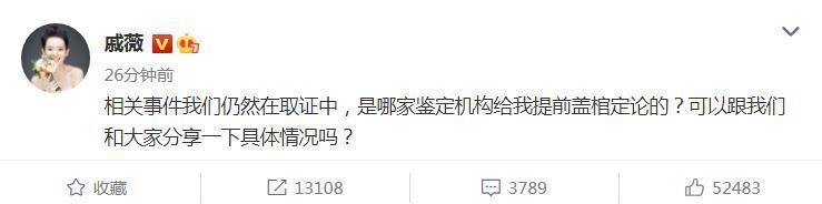 随后戚薇也是非常有底气的向鉴定机构发问:“相关事件我们仍然在取证中,是哪家鉴定机构给我提前盖棺定论的?可以跟我们和大家分享一下具体情况吗?”