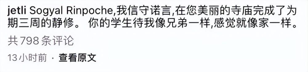 在配文中李连杰表示,此次的清修一共持续了三周,他在当地的人缘颇好,和大家的相处就像是家人一般。