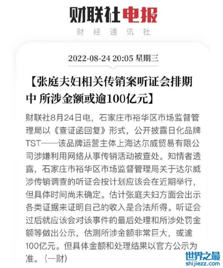 8月24日传来关于他们夫妻传销案的最新动态消息,关于市监督局的最新回应,目前他们的案子已经处于听证会的排期之中,并且初步估测所涉的金额非常巨大,高达100多亿元。