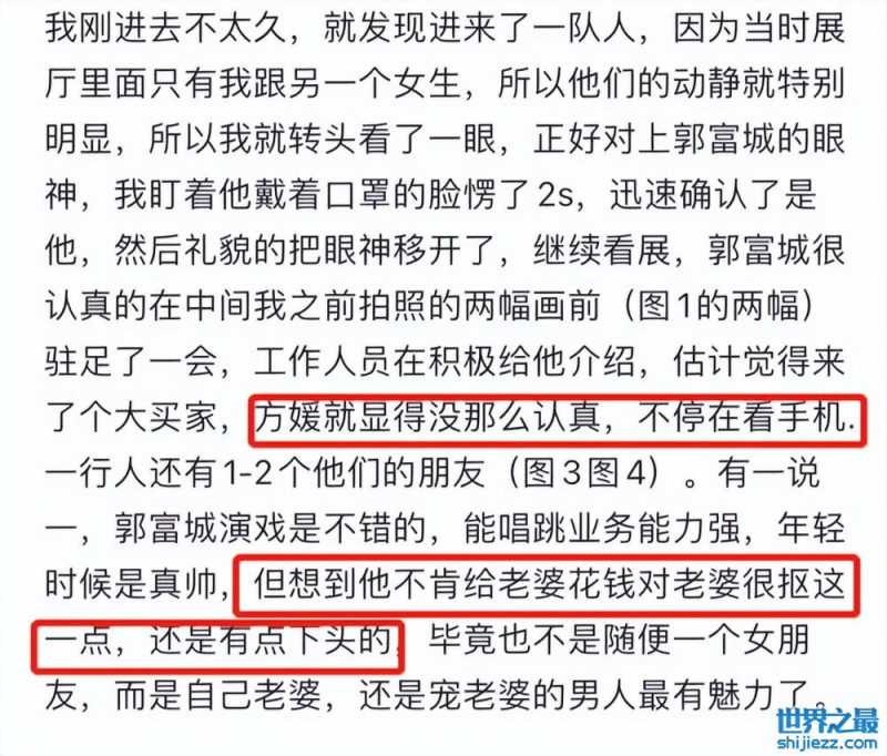 一旁的工作员非常认真地和郭富城在讲解墙上的艺术品,方媛则是在老公身后百无聊赖地玩手机,似乎对墙上挂着的艺术品并不在乎。