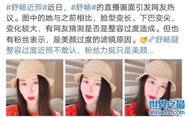 早前开直播的时候,舒畅还因为脸型长、脸部太过僵硬,连同过去漂亮的杏仁眼也被脸部的膨胀给挤到僵硬的感觉。