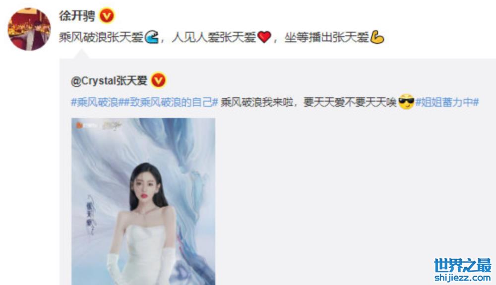 去年5月,徐开骋与张天爱主演的电视剧《我的漂亮朋友》播出,两人也是因戏生情。今年张天爱参加《浪姐》,徐开骋还发文打CALL。