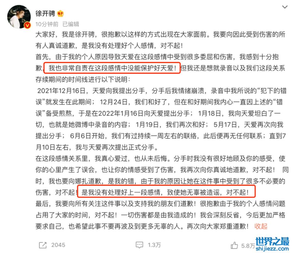 事情发酵后,徐开骋也回应了,并向两位女生道歉,但核心思想仍是:自己没有同时与张天爱、娜扎保持恋爱关系,时间线是清晰的。但是酒后乱性一事,徐开骋承认了。