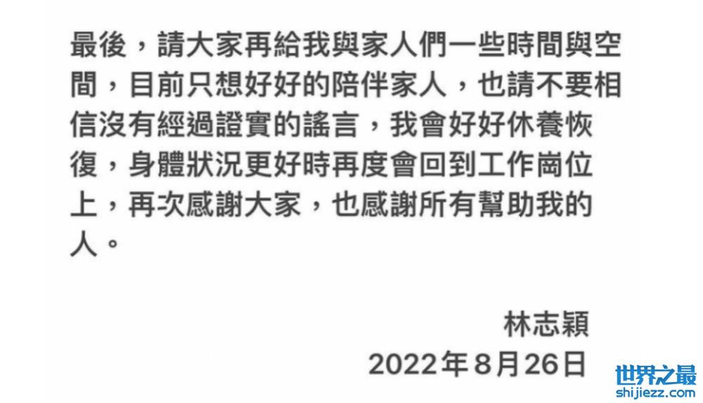 最后,林志颖特别强调希望外界给他和家人一些时间,目前他只想在家好好陪伴家人,也希望网友们不要相信网络上的谣言,很多都是不实报道。等身体恢复之后,林志颖调整好状态后,会再度回到自己的工作岗位上。