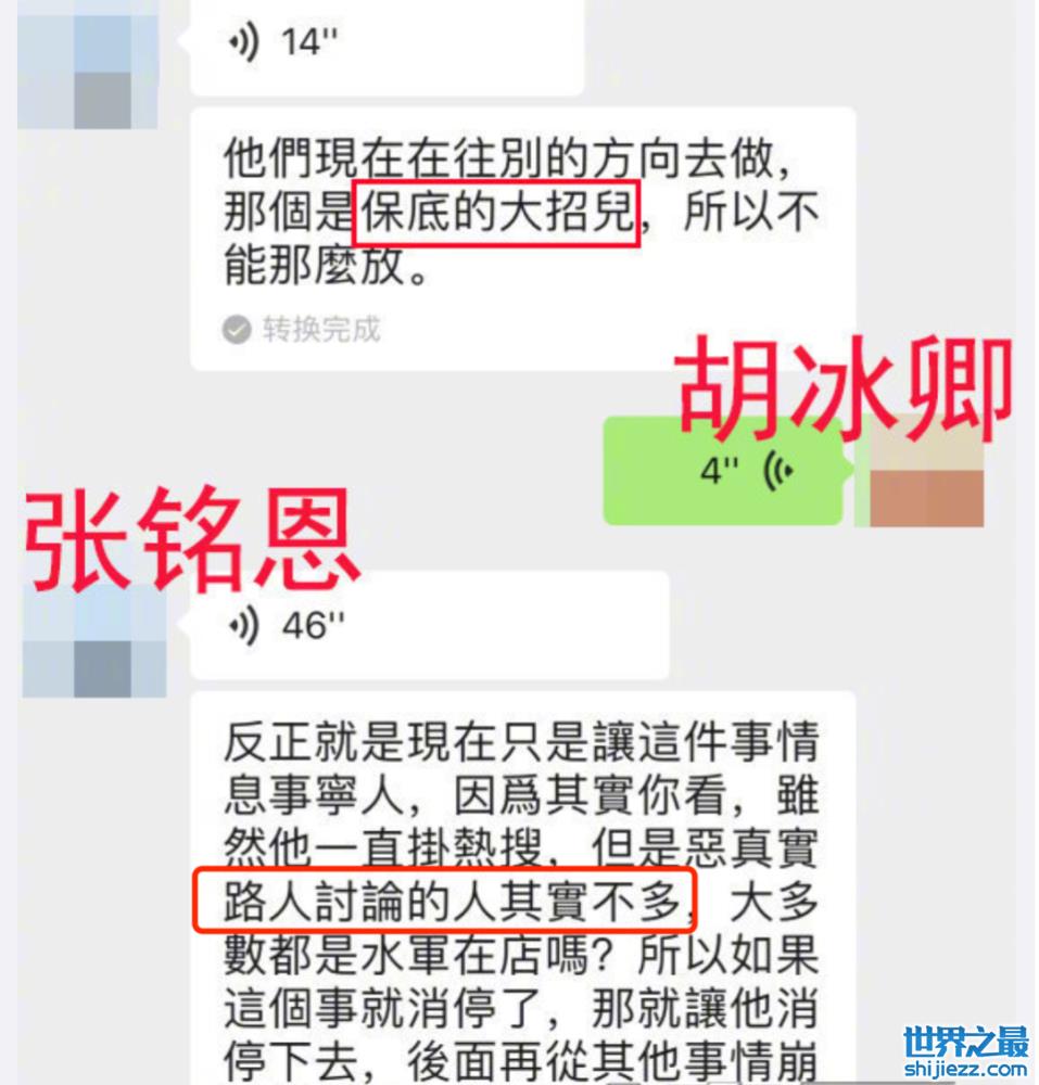 本来,分手后再恋爱无伤大雅,只要说清楚就好了。但是胡冰卿甩出一段自己与张铭恩的聊天记录,内容是张铭恩教胡冰卿怎样手撕徐璐,并让胡冰卿说是徐璐找人故意黑。幸好胡冰卿并没有这么做,而是揭露了张铭恩的真面目。