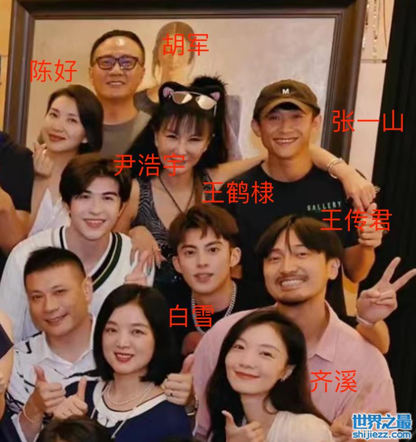 在看到宋丹丹左边的一堆人,有我们罕见露面的演员陈好,对着镜头笔芯好可爱,她背后站着的是演员胡军。张一山戴着帽子一脸痞笑,被美女霸气肩;演员王传君站在老婆齐溪身后,咧嘴笑的表情特别呆萌;还有一夜成顶流的王鹤棣,这五官挡不住的帅气。