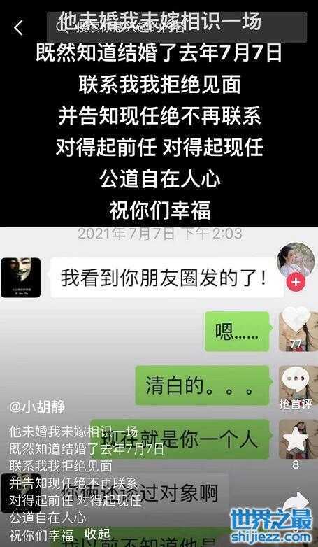 近日,网红小胡静再次放出实锤,并称:“他未婚我未嫁相识一场既然知道结婚了,去年7月7日联系我,我拒绝见面并告知现任绝不再联系,对得起前任,对得起现任,公道自在人心祝你们幸福”。