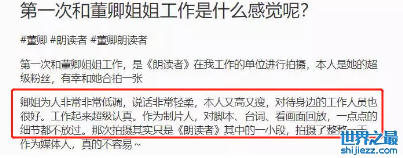 而与其一同工作的网友还在配文中说道,董卿在整个工作过程中所表现出来的认真和温柔,尤其明显。即便只是录制了《朗读者》的一小段,但从画面,脚本等各个环节,董卿都亲力亲为不漏过任何一个细节,一小段节目就录制了一整天。